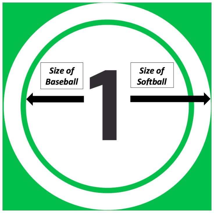 With the inner circle the size of a baseball, and the outer circle the size of a softball.