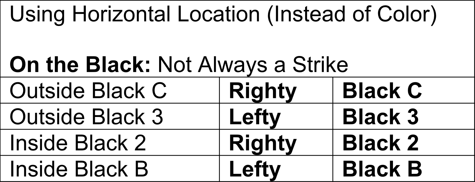 Think: Inside Black, Inside Corner, Middle in, Middle, Middle Away, Outside Corner, Black Away